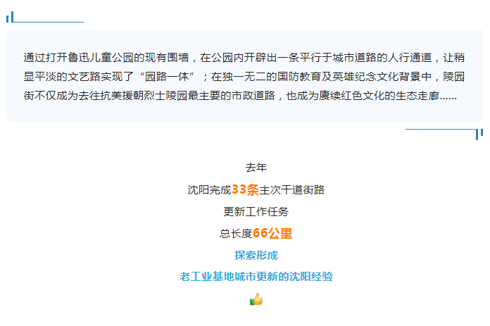 去年,沈阳完成33条主次干道街路更新工作任务,总长度66公里,探索出“以车为本”转向“以人为本”,实施范围由“道路红线”转向“完整街道”,设计导向由“工程设计”转向“人文关怀”的工作理念,设计方案涵盖道路、市政、景观、建筑四大板块、12个类别、45个要素,目前已初步形成可推广、可复制的老工业基地城市更新的沈阳经验。